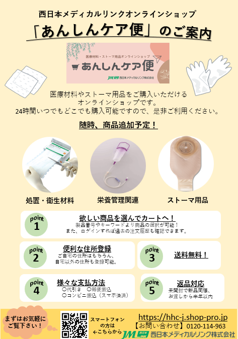 2025.12.4 お知らせ、コールセンターお知らせ、ストーマ関連について、災害関連 医療材料やストーマ用品 ネットショップのご案内 医療材料やストーマ用品をご購入いただけるオンラインショップです。 24時間いつでもどこでも購入可能ですので、是非ご利用ください。